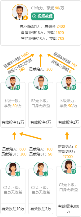 代理依照线下总税收来进行返利,假设您线下有10个代理,每个代理都替您产生了10万的税收,直属代理返利加起来就是100万*30%=30万,其中30万的30%=90000即是您的返利,百位代理的佣金可想而知是多麽可观!不要小看每一个代理,每天人数都是在几何倍增,这里倍增可不是1+2+2+2,而是1x2x2x2的几何倍增。